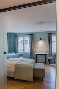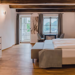 The hotel features eight stylish double rooms and junior suites, including options with a private sauna, balcony, or wheelchair access. Elegance and history merge throughout the hotel into a harmonious overall concept. At the same time, each room has its own unique character. Some rooms impress with striking wall and ceiling paintings, others with exposed historic beams or original brickwork. This creates a special atmosphere where history and modern comfort authentically blend.
