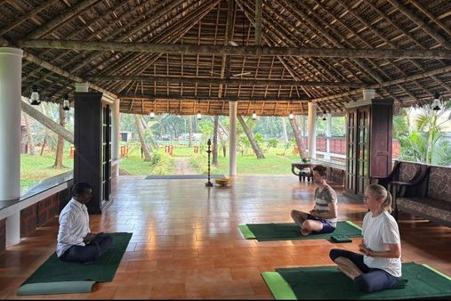 The tranquil setting of the resort provides ideal conditions for relaxation and rejuvenation. After Ayurveda treatments or yoga sessions, guests can unwind by the pool or on beach loungers, enjoying the peaceful coastal atmosphere. A variety of activities such as cultural programmes, cooking demonstrations, and creative options like Mehndi designs or draping traditional sarees ensure a diverse experience. Nature and animal lovers can visit the nearby fishing village or explore the elephant camp in Guruvayur. Those interested in culture and history will find the Muzariz Heritage or the historic port city of Cochin with Fort Cochin, the Jewish quarter, the famous Chinese fishing nets, and St. Francis Church particularly fascinating.