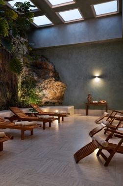 The 3000 sqm Thermal Spa (open from 10 a.m. to 7 p.m.), featuring a Meditarium, a summer pool Oasi (closed from October to April), treatment rooms, relaxation areas, and a fitness area, is a captivating retreat inspired by the impressive thermal cave. The Meditarium, in various shades of rock, includes two saunas, a Roman bath, steam bath, indoor thermal pool with hydromassage jets, sensorial showers, and ice fountain.