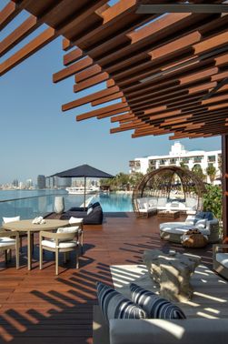 First-class dining facilities, including the seafood restaurant 'Noepe' with panoramic views, 'The Thai Kitchen' featuring a show kitchen and authentic Thai dishes, 'Brasserie du Park' offering international cuisine. Additionally, 'Twiggy by La Cantine' by the lagoon serves Mediterranean dishes, 'Boardwalk' right at the Dubai Creek Marina, 'Lakeview' with jazz music at the golf course, rooftop bar 'Cielo Sky Lounge' with live music, innovative cocktails, and views over the marina, and 'Pool Bar' amidst the tropical hotel gardens by the pool. Breakfast buffet at 'Brasserie du Park', with half board option of lunch or dinner Dine Around in 6 restaurants possible (1 water/soft drink per meal included). More restaurants: 'The Cinnamon Club', a modern Indian fine dining restaurant with Middle Eastern influences. 'The Lounge' serves afternoon tea. 'QD's Bar & Grill' is the perfect outdoor spot with shisha, snacks, and a DJ. Australian restaurant 'Jones the Grocer' and 'Ibn AlBahr' with traditional Lebanese fish dishes.